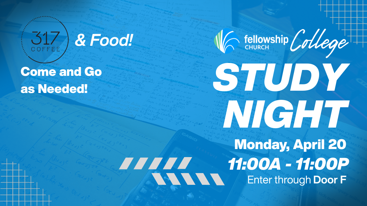 Need a focused space to get your studying done? Join us for College Study Night in the Youth Room! We’ll have coffee from 317, plus food and snacks to keep you going all day.